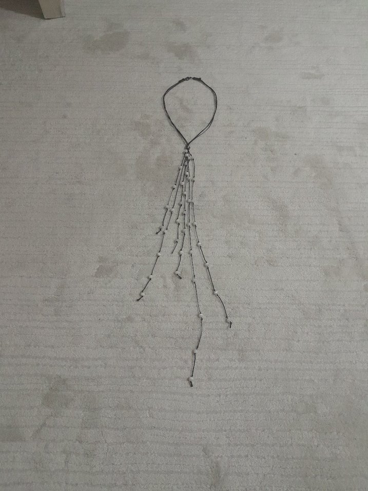 Gri boncuklarla süslenmiş, yılan desenli uzun bohem tarzda kadın kolyesi, günlük kullanıma uygun.