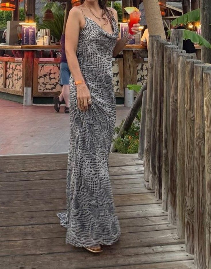 Gri yılan desenli, uzun ve vücuda oturan abiye elbise. Drapeli tasarım ve V yakaya sahip, ince askılı, yumuşak sentetik kumaştan üretilmiştir.