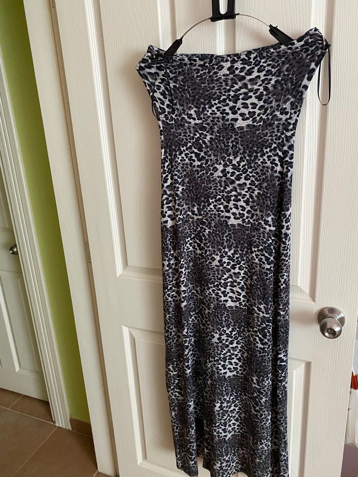 Gri yılan desenli, drapeli ve straplez likralı uzun elbise. Yumuşak sentetik kumaştan, kolsuz ve günlük sokak modası için uygun.