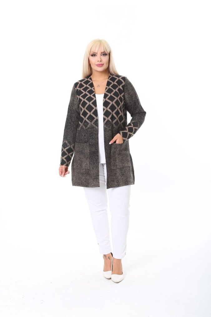 Gri yılan desenli, uzun ve bol kesim kadın hırka. Triko kumaştan, yakasında kürk detayları ve uzun kollu. son ürünler