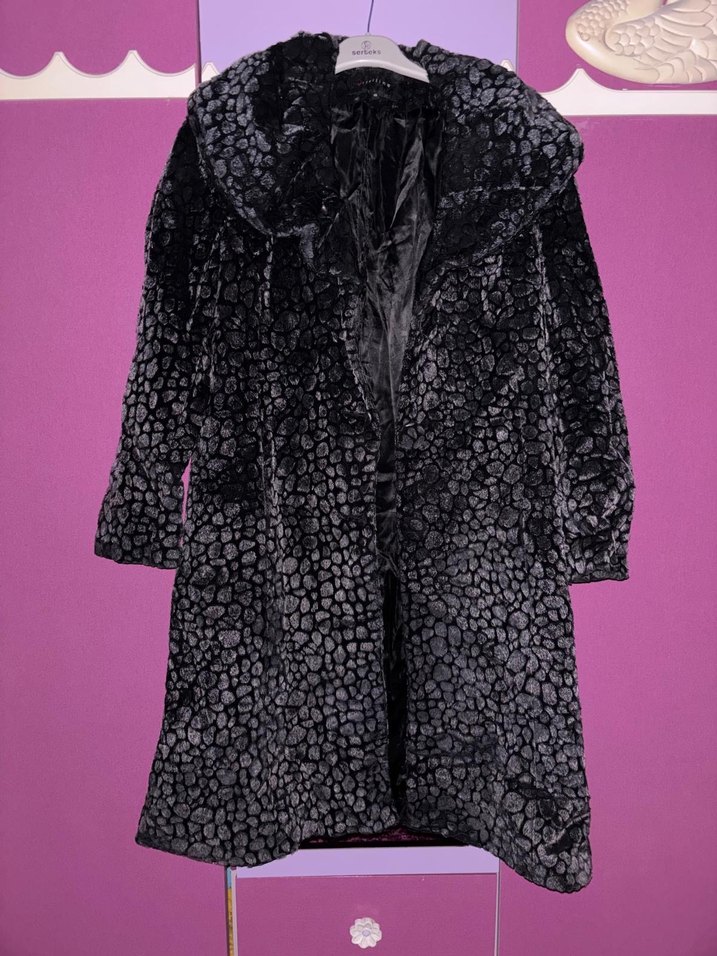 Fitted kesim, uzun kollu, yılan desenli koyu gri kadın kaban, kürk detaylı ve notched yakalı, gotik stile uygun.
