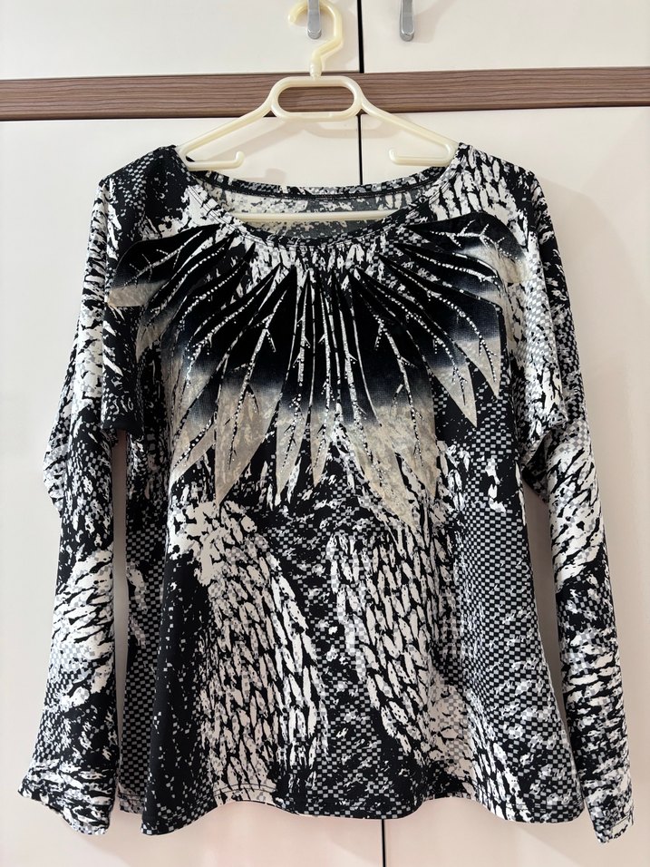 Gri yılan desenli, uzun kollu, kayık yaka, pileli ve bol kesim kadın bluz. Bohem ve avangart tarzda, günlük kullanıma uygun.