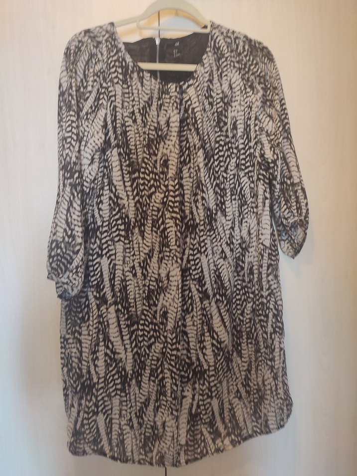 Gri desenli, uzun kollu ve salaş kesim elbise. Kayık yaka ve drapeli detaylar içerir, günlük kullanıma uygundur.