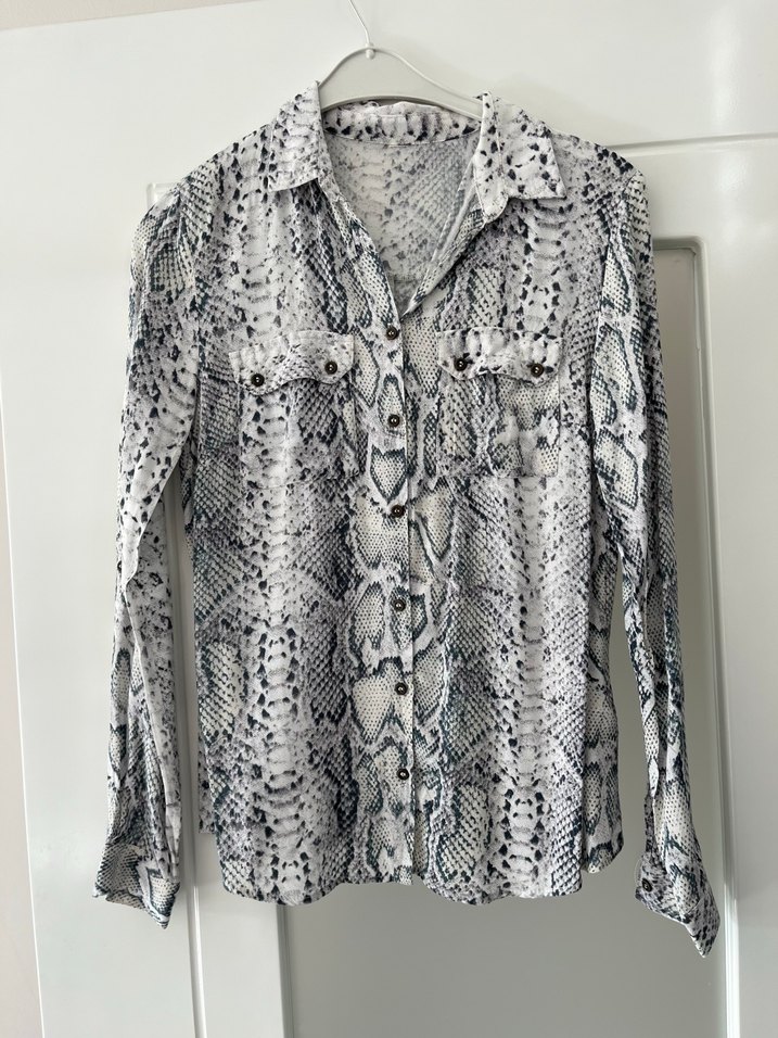 Gri yılan desenli, düğmeli, yakalı ve uzun kollu kadın gömleği. Rahat kesimli ve midi boyda, sentetik yumuşak kumaştan üretilmiştir. Bohem tarzda bir tasarıma sahiptir.