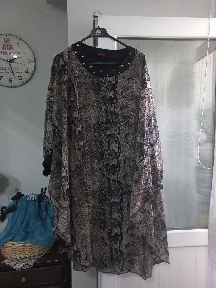 Gri yılan desenli, uzun kollu ve salaş kesim kadın tunik. Drapeli yapısı ve bohem-goth tarzıyla dikkat çeker.