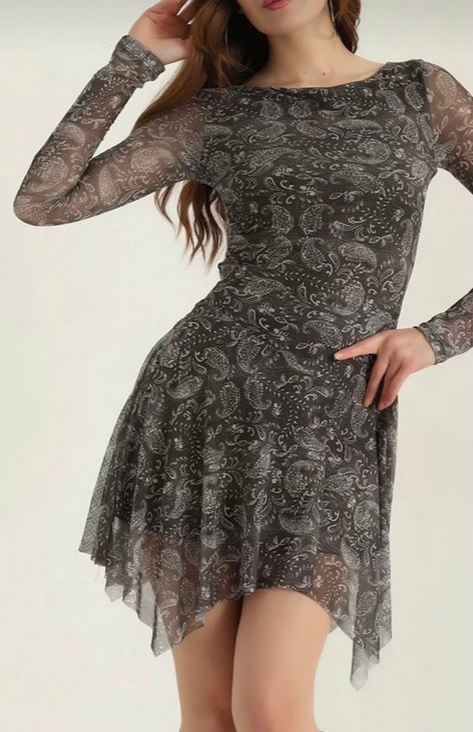 Gri Yılan Desenli Uzun Kollu Mini Dantel Elbise