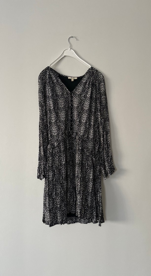 Gri yılan desenli uzun kollu, pilili ve bol kesim elbise. V yaka ve sentetik kumaş kullanılmıştır, romantik buluşmalar için uygundur.