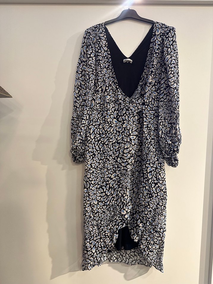 Gri renkte, yılan desenli, uzun ve bol kesim elbise. V yaka, uzun kollu ve dökümlü tasarıma sahip. Sentetik kumaştan yapılmış, günlük kullanıma uygun şık bir parça.