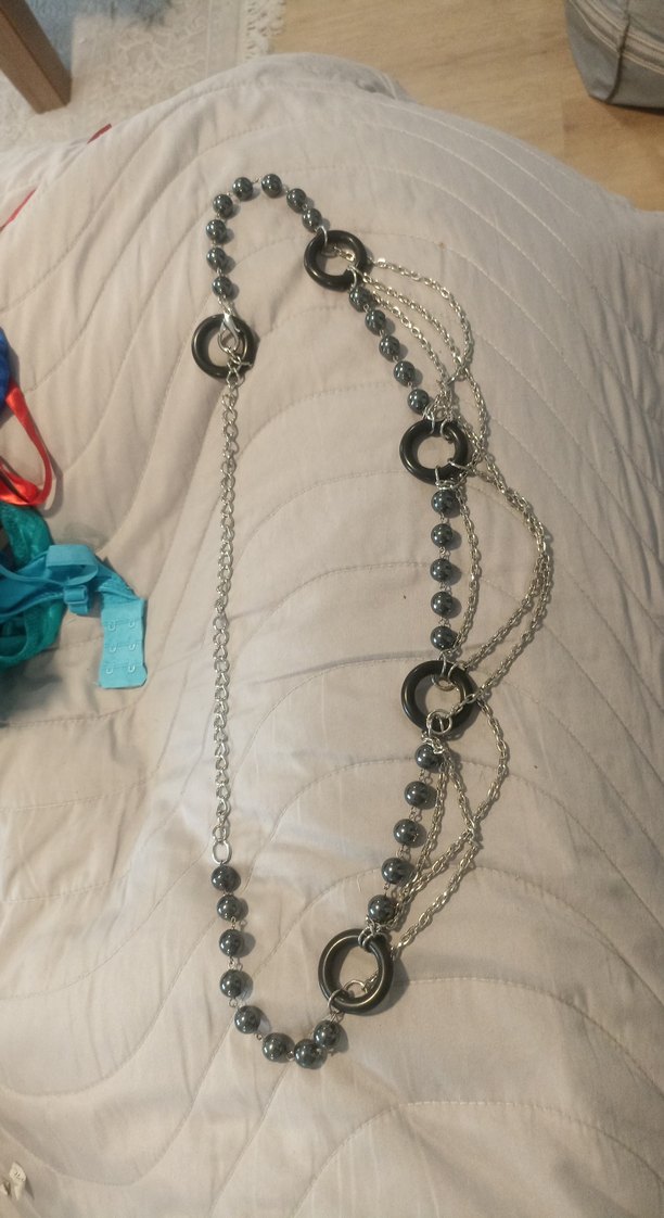 Gri yılan desenli boncuklar ve zincir detaylı uzun kolye, gotik, bohem ve retro stiller için uygundur. Günlük kullanıma idealdir.