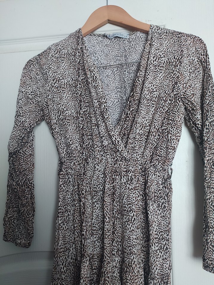 Gri yılan desenli, V yakalı ve düğmeli uzun kollu elbise Bol kesim, yumuşak sentetik kumaştan, bohem tarzda günlük kullanıma uygun.