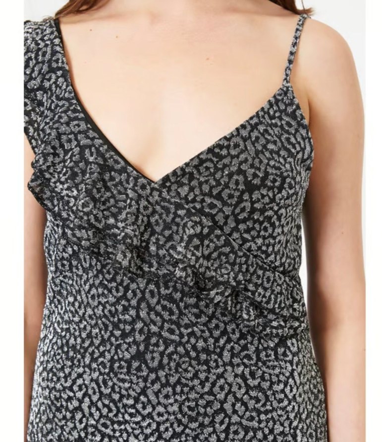 V yakalı, askılı ve yılan desenli gri midi elbise, fırfır detaylı ve vücuda oturan kesime sahip, romantik akşamlar için uygun.