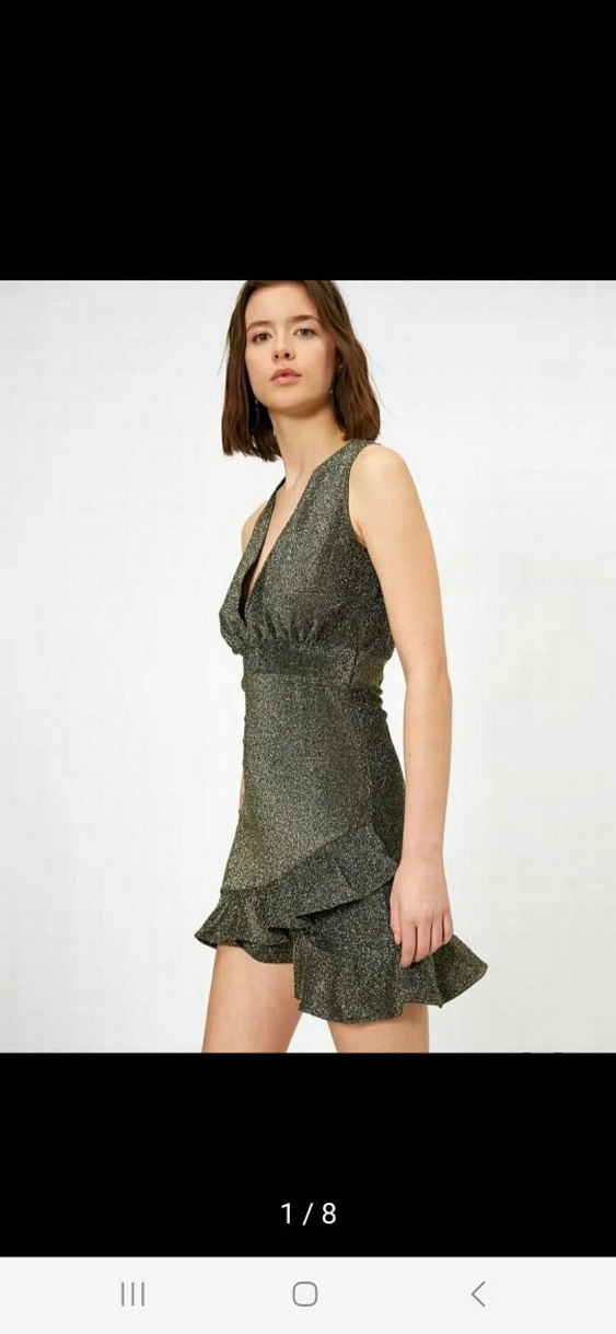 V yakalı, kolsuz ve vücuda oturan mini elbise, gri yılan desenli ve fırfır detaylı, parti için uygun.Koton (party wear), XS beden, etek uçları fırfırlı, simli mini elbise. Sıfır ayarında tertemiz bir ürün. Kumaşı likralı. ÜRÜN ÖLÇÜSÜ; GÖĞÜS 39CM, BEL 32CM, BOY 83CM.