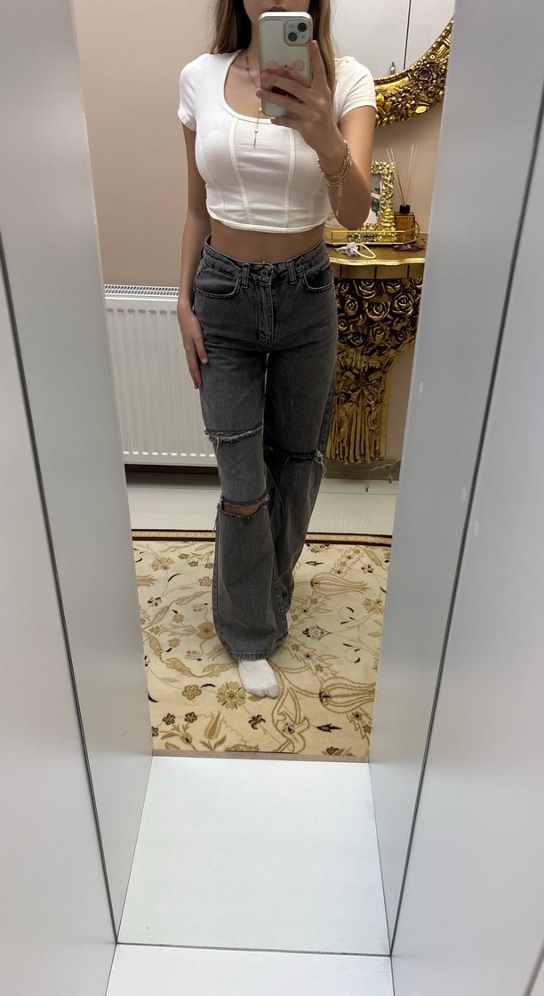Gri Yılan Desenli Yırtmaçlı Bol Kesim Jean