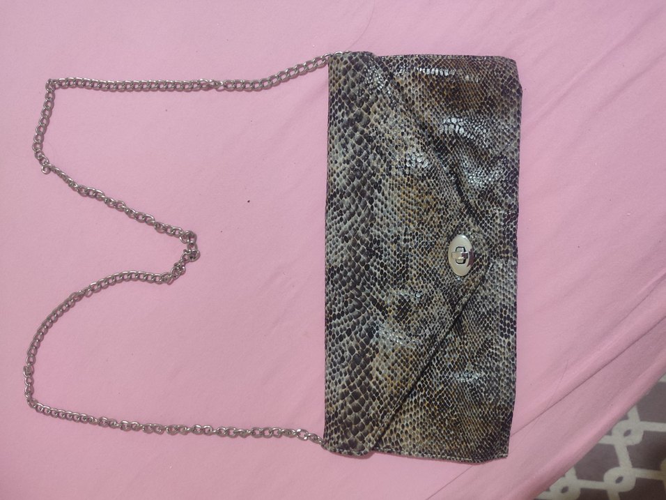 Gri yılan desenli deri çanta, zincir detaylarıyla bohem tarzda, günlük kullanıma uygun bir modeldir.