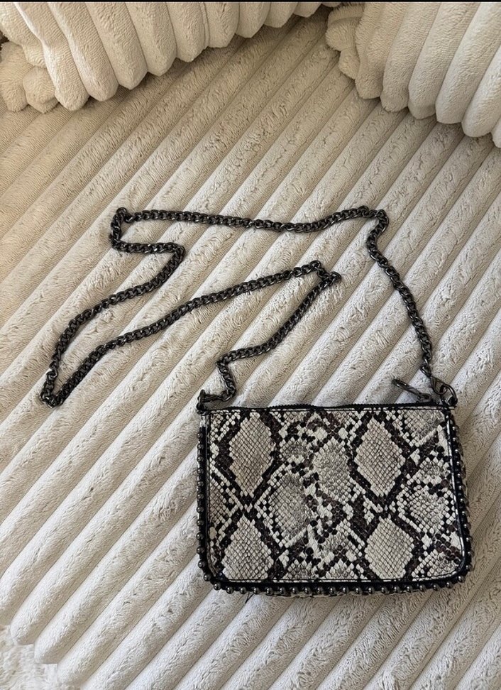 Gri yılan desenli deri çanta, zincir detaylarıyla bohem ve Paris tarzını birleştirir, günlük kullanıma uygundur.