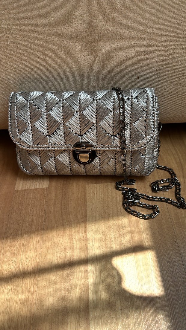 Gri yılan desenli, zincir detaylı kadın çantası. Sentetik kumaştan, bohem ve Paris tarzıyla günlük kullanıma uygun.