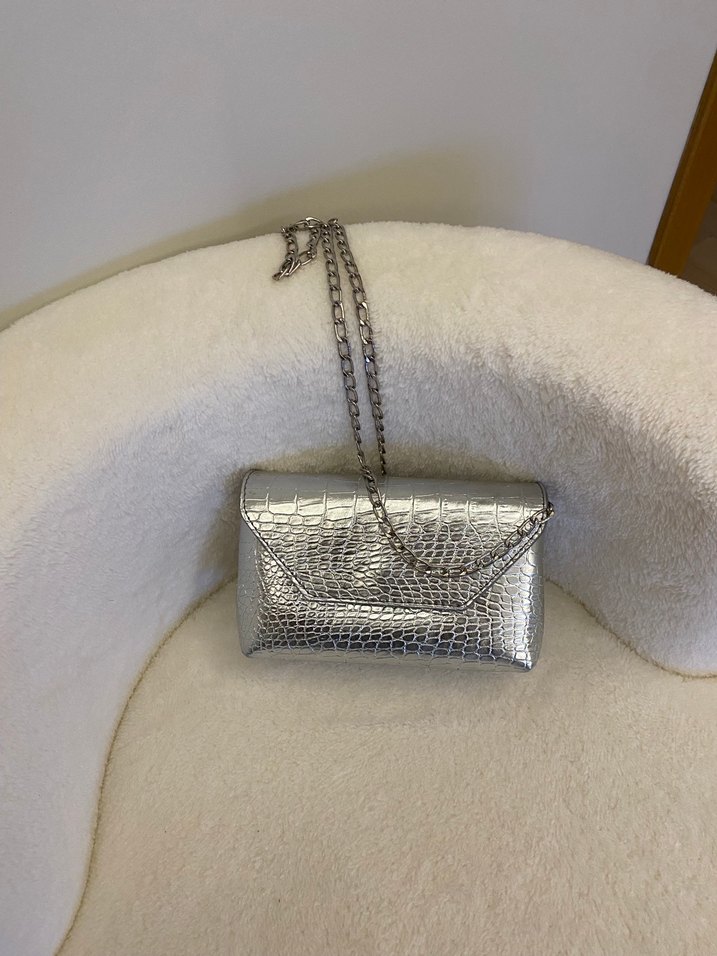 Gri yılan deseni ve metal zincir detayına sahip kadın çantası, minimal ve çağdaş tarzıyla günlük kullanıma uygundur. markası belirsz