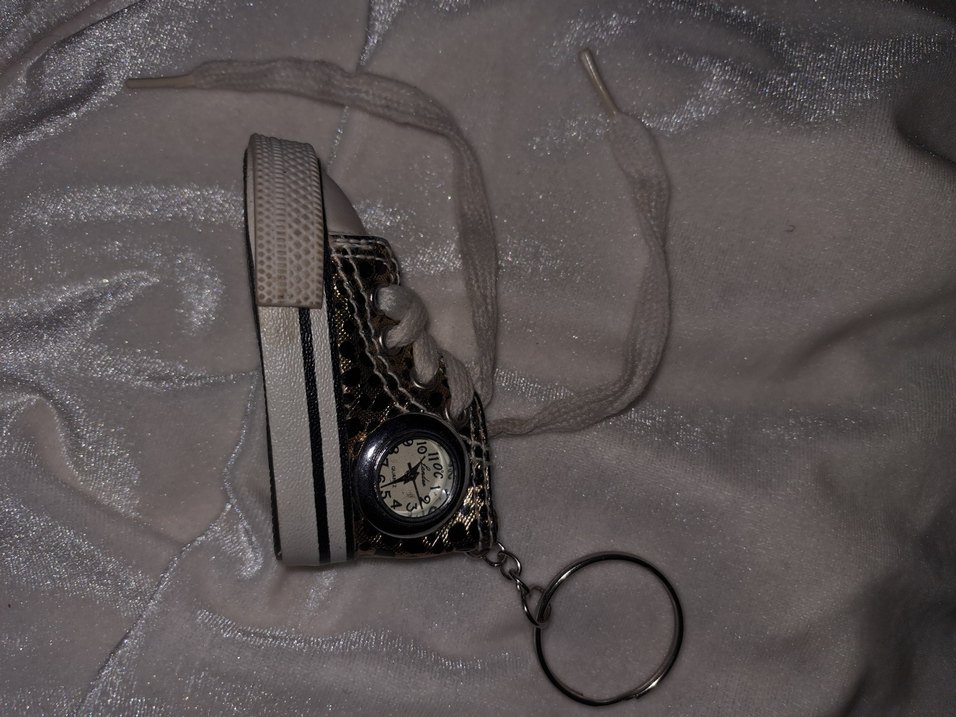Gri yılan desenli sneaker şeklinde anahtarlık saat. Yanında küçük saat ve metal zincir bulunur.