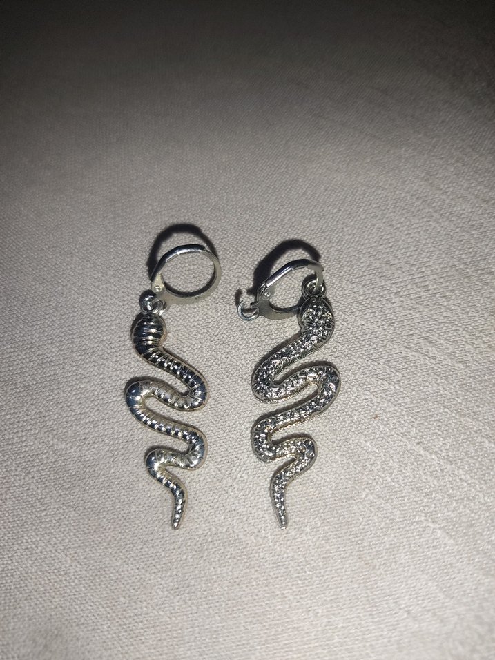 Gri yılan figürlü, minimalist goth tarzda kadın küpeleri. Rock punk havası veren hafif ve detaylı metal işçilikli tasarım.