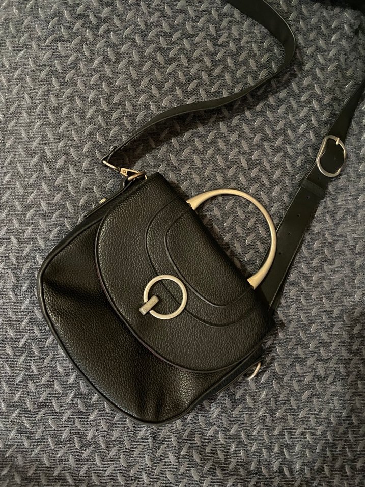 Gri yılan desenli siyah deri kadın çantası, tokalı askısıyla Parisian goth tarzını trendy casual tasarımla buluşturuyor.