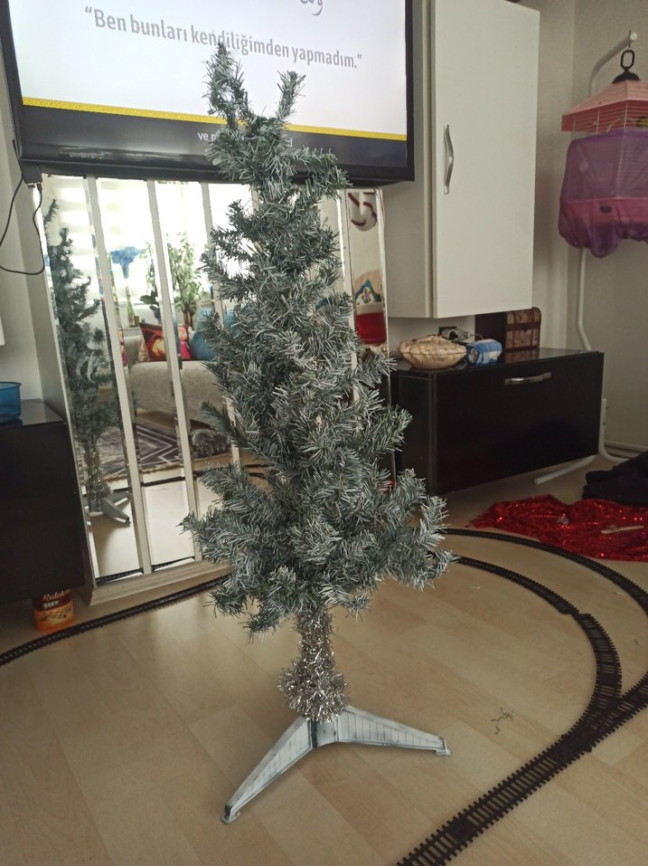 üç ayaklı standlı küçük gri yapay yılbaşı ağacı. Hafif buzlu görünümüyle odada yer alıyor. 115cm