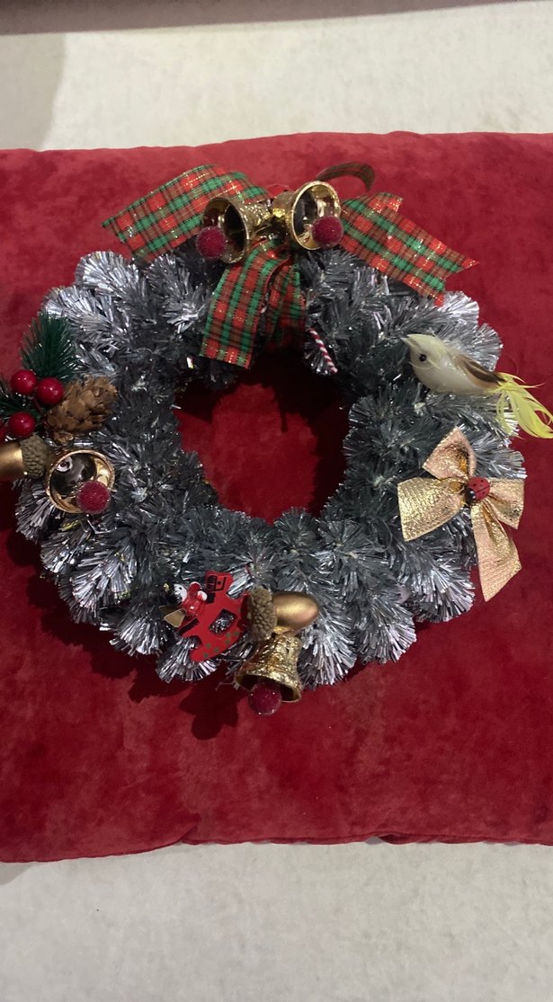 Kırmızı ve altın fiyonklar, çanlar, kozalaklar ve küçük bir kuşla süslenmiş gri yılbaşı kapı çelengi.