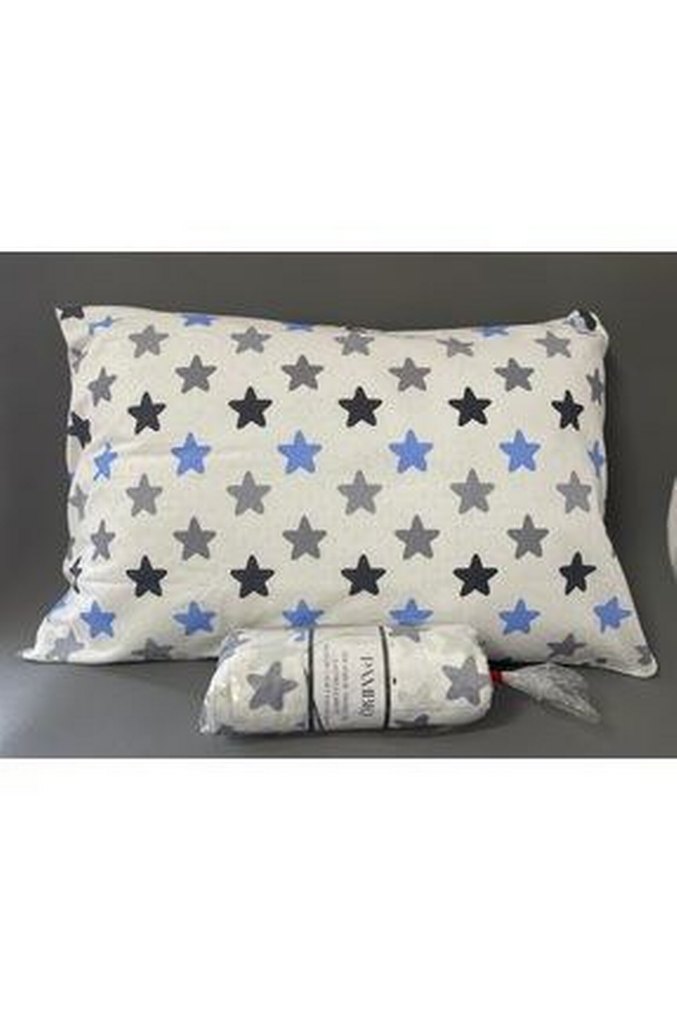 Gri zemin üzerinde siyah, mavi ve gri yıldız desenleri bulunan yumuşak kumaştan baskılı yastık kılıfı ve lastikli çarşaf Rahat ve dekoratif bir seçenektir. ⭐