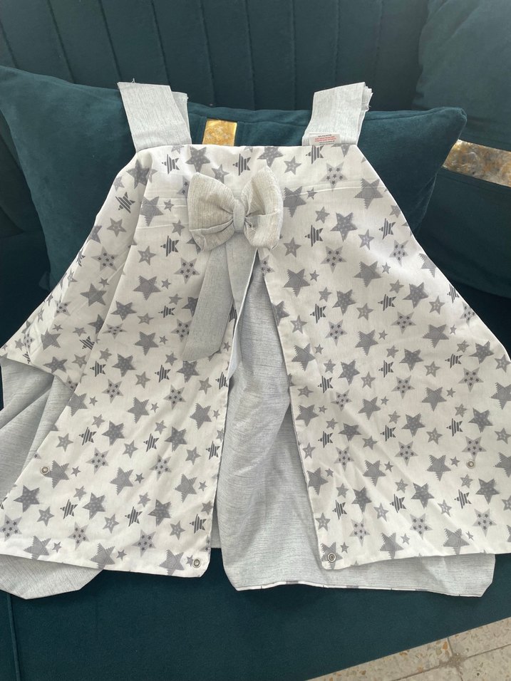 Yıldız desenli gri bebek kanguru, konforlu yumuşak kumaştan, dekoratif fiyonk detaylı.