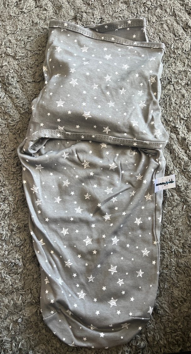 Yumuşak sentetik kumaştan yapılmış, beyaz yıldız desenli gri bebek kundak örtüsü, rahat uyku için uygundur.