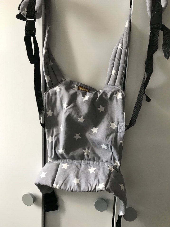 Gri renkli, yıldız desenli bebek taşıyıcıdır. Ayarlanabilir askılarıyla rahat kullanım sağlar.