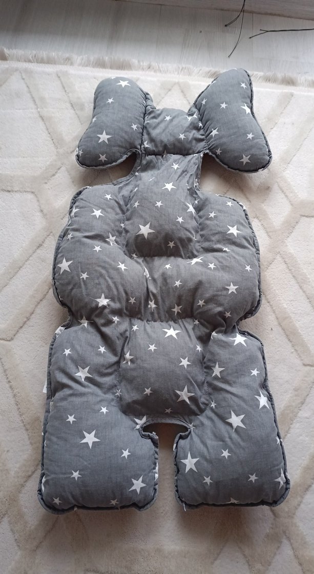Yumuşak sentetik kumaştan yapılmış, gri renkli ve yıldız desenli bebek uyku minderi, rahat uyku için tasarlanmıştır. Bebek Arabası minderi