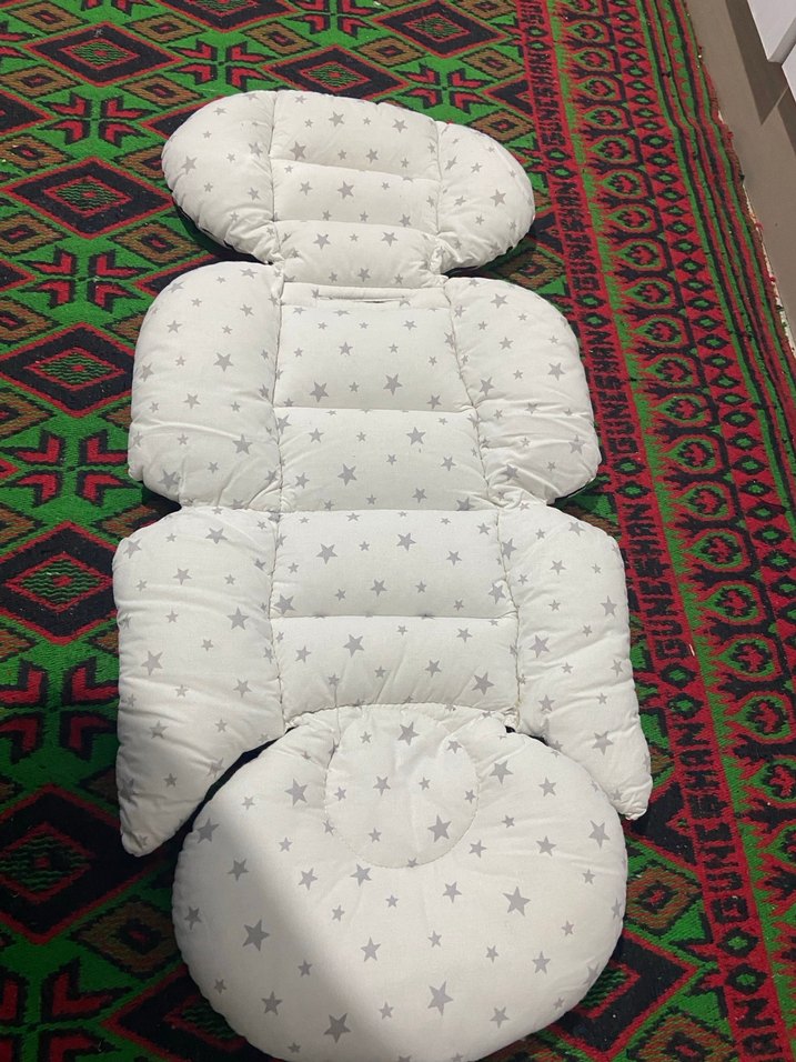 Yumuşak sentetik kumaştan yapılmış, gri yıldız desenli beyaz bebek uyku minderi. ⭐ Ürün bir kaç kez kullanıldı ihtiyaç fazlası