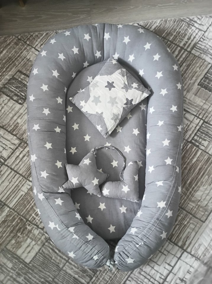 Gri yıldız desenli bebek uyku seti. İçinde yastık bulunur. ⭐tasinabilir bebek yatağı