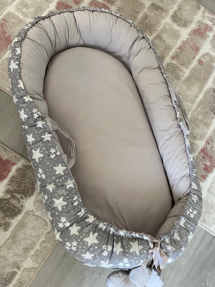 Gri yıldız desenli, yumuşak sentetik kumaştan yapılmış bebek uyku yatağı, rahat ve güvenli bir uyku alanı sunar. ⭐