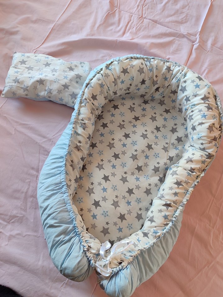 Yumuşak sentetik kumaştan yapılmış, gri yıldız desenli pastel renkli bebek uyku yuvası ve yastık seti. az kullanildi sorunsuz