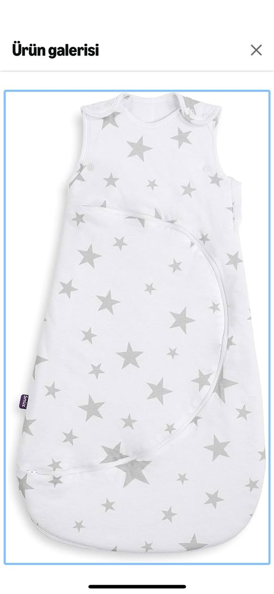Yumuşak ve sıcak kumaştan, gri yıldız desenli beyaz bebek uyku tulumu, uyku konforu için tasarlanmıştır.