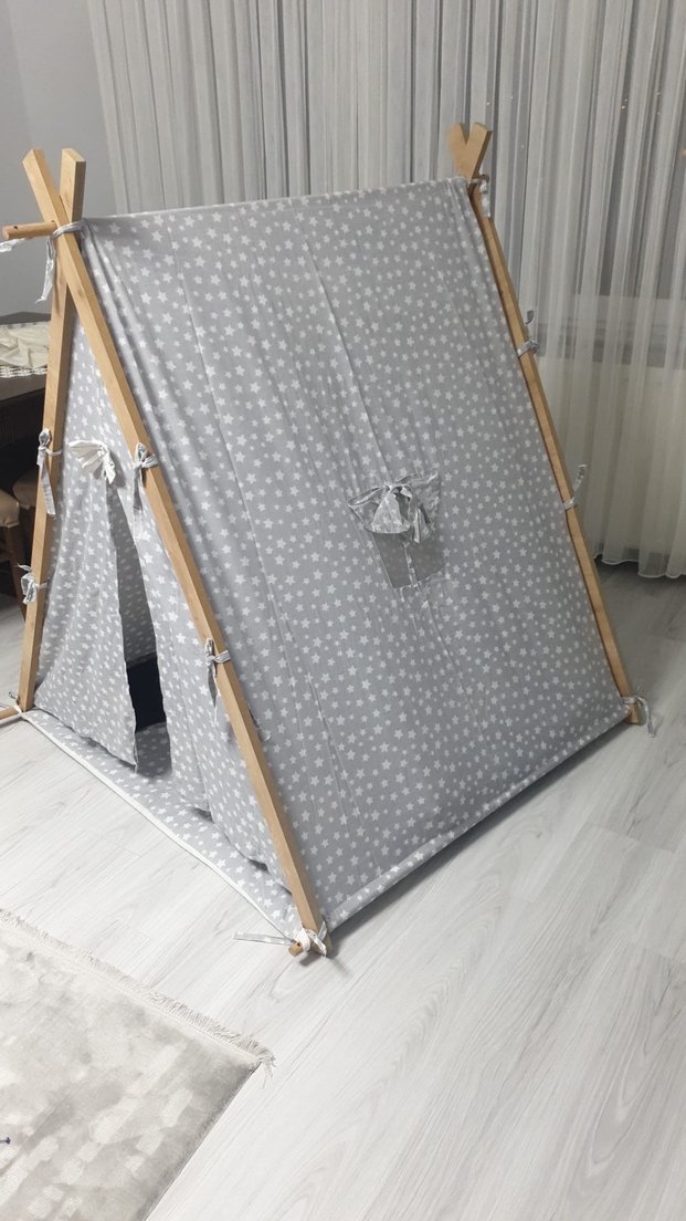Gri renkte, yıldız desenli çocuk oyun çadırı. Sentetik kumaştan üretilmiş, ahşap çerçeveli ve yanlarda bağlamalı kapakları bulunur. ⭐
