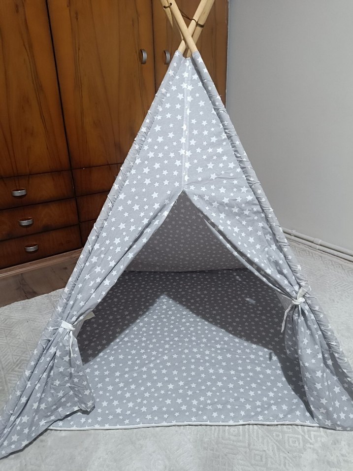 Gri yıldız desenli, nakışlı çocuk oyun çadırı, yumuşak sentetik kumaştan üretilmiştir. Çocuklar için konforlu bir alan sağlar. ⭐