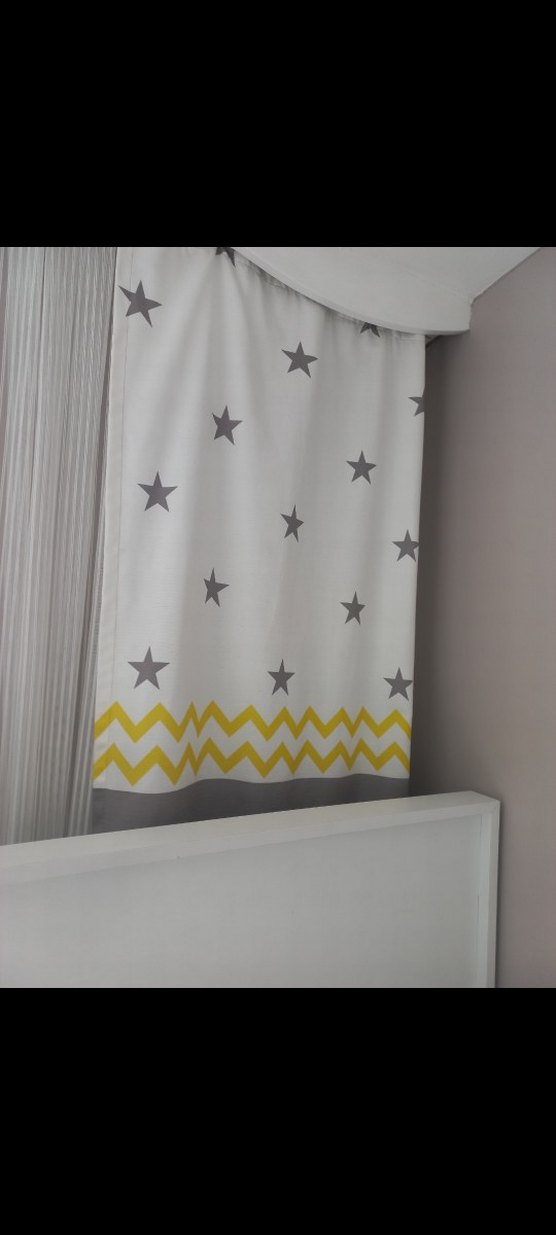 Gri renkte, yıldız desenli ve alt kısmında sarı zikzak deseni bulunan çocuk odası perdesi. Sentetik kumaştan üretilmiştir. 65×2 metredir ölçüsü