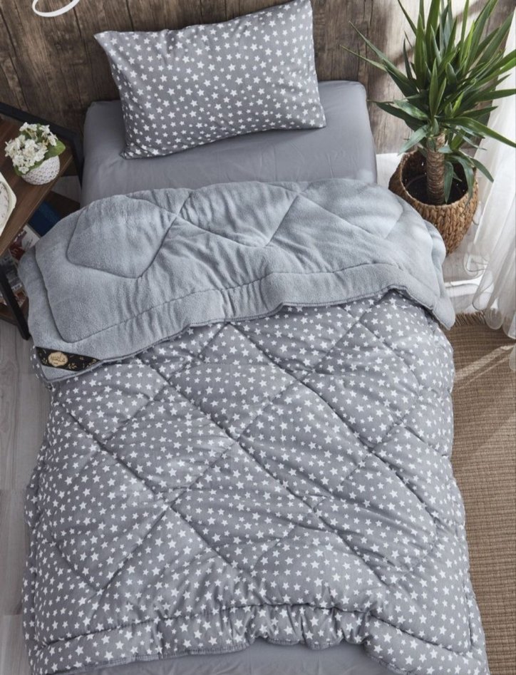 Yumuşak ve sıcak gri battaniye ile beyaz yıldız desenli uyku yastığı içeren çocuk uyku seti. yorgan 155*215 yastık kılıfı 50*70 adet 1