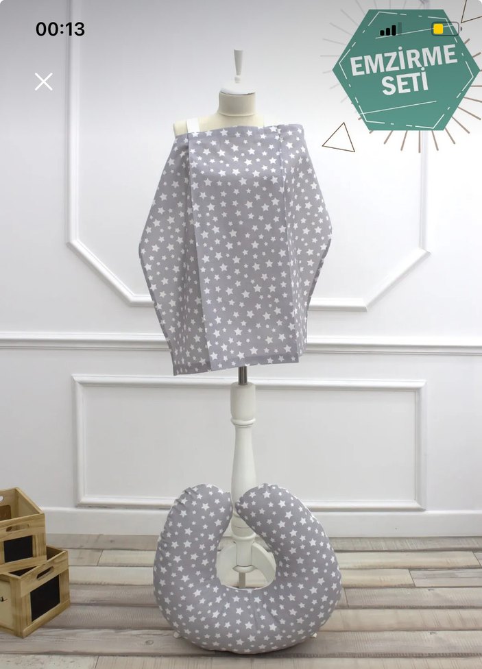 Gri zemin üzerinde beyaz yıldız desenli emzirme örtüsü ve U şeklinde destek yastığı seti. Emzirme sırasında rahatlık ve gizlilik sağlar. Sayılı kullanıldı hiç bir kısuru yok emzirme önlüğü ile birlikte yollayacağım ütüsüz olduğu için çekmek istemedim.