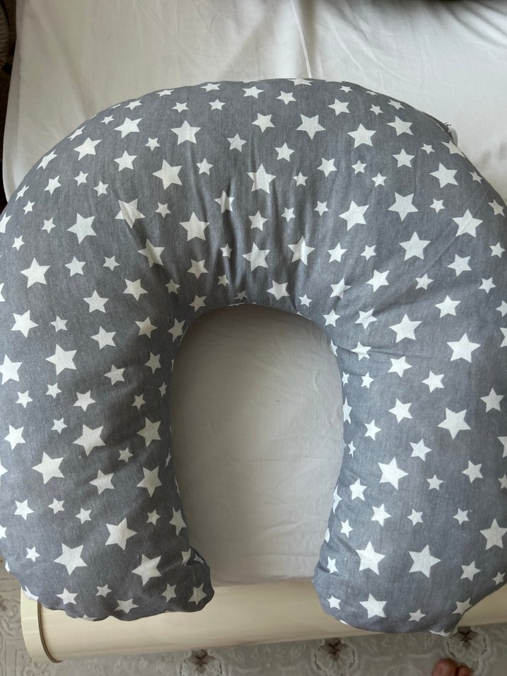 Gri renkte, beyaz yıldız desenli emzirme ve hamile yastığı, anne ve bebek için rahat destek sağlar.