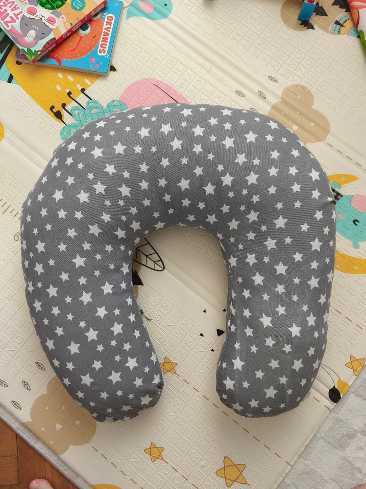 Gri zemin üzerine beyaz yıldız desenli emzirme ve hamilelik yastığı, rahatlık ve destek sağlar.