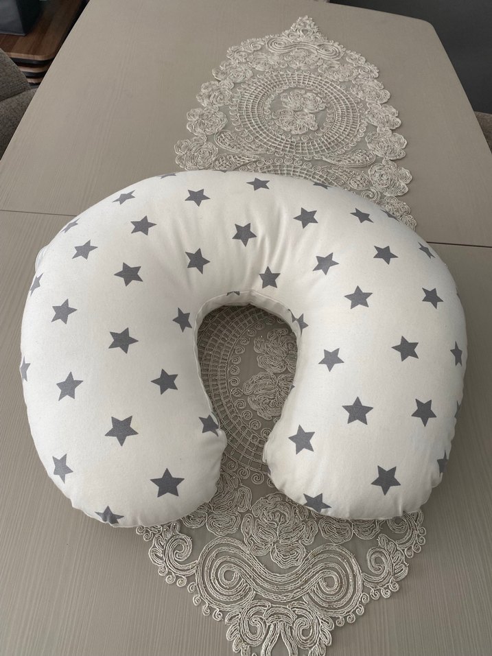 Gri yıldız desenli emzirme ve hamilelik yastığı, hamilelik ve beslenme sırasında destek ve konfor sağlar. ⭐