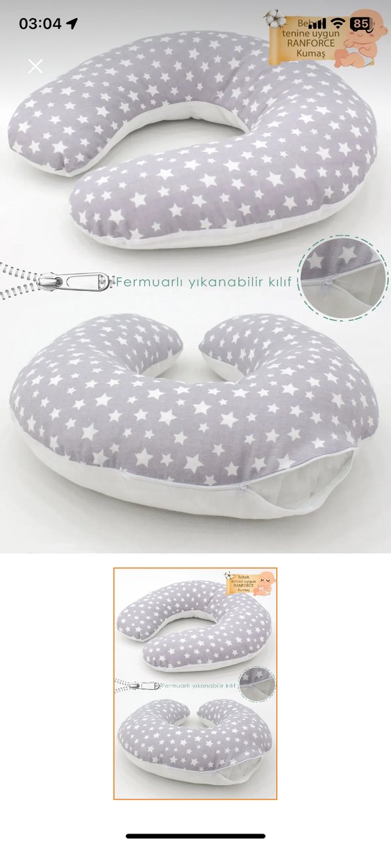 Gri yıldız desenli emzirme ve hamilelik yastığı, fermuarlı yıkanabilir kılıfı ile rahatlık ve kolay temizlik sağlar. Mordesign sayfasından aldım