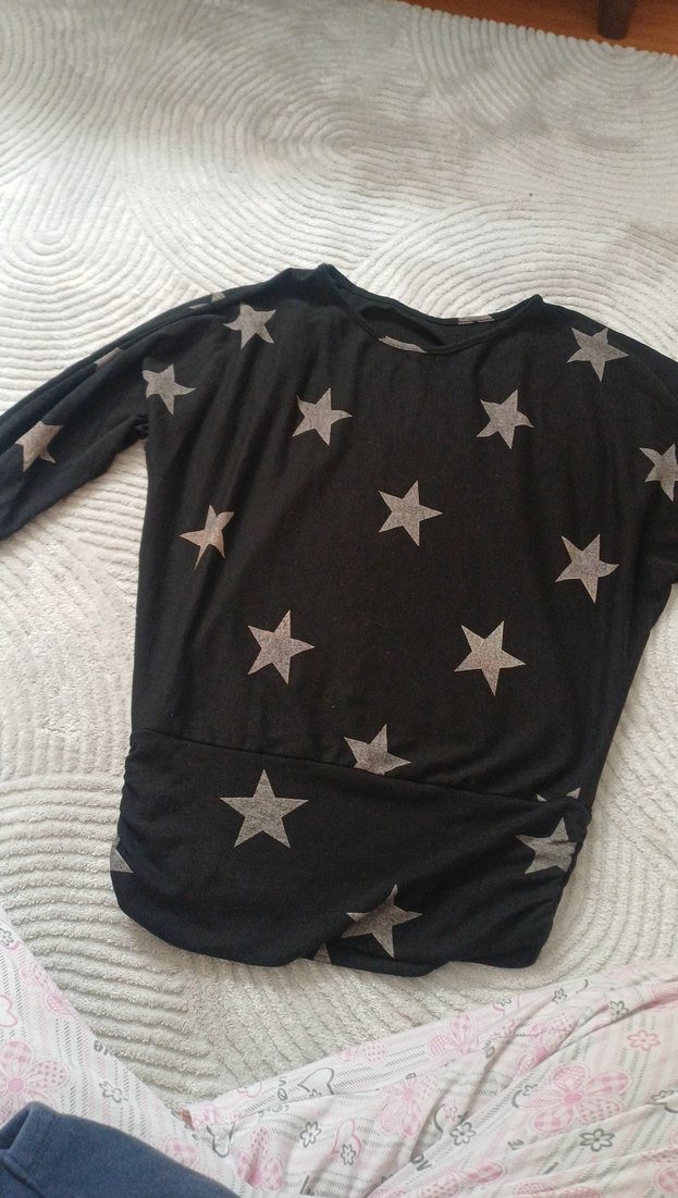 Gri yıldız desenli, uzun kollu, yuvarlak yakalı, bol kesim hamile tişörtü. Salaş ve drapeli tasarımıyla sokak stiline uygun.