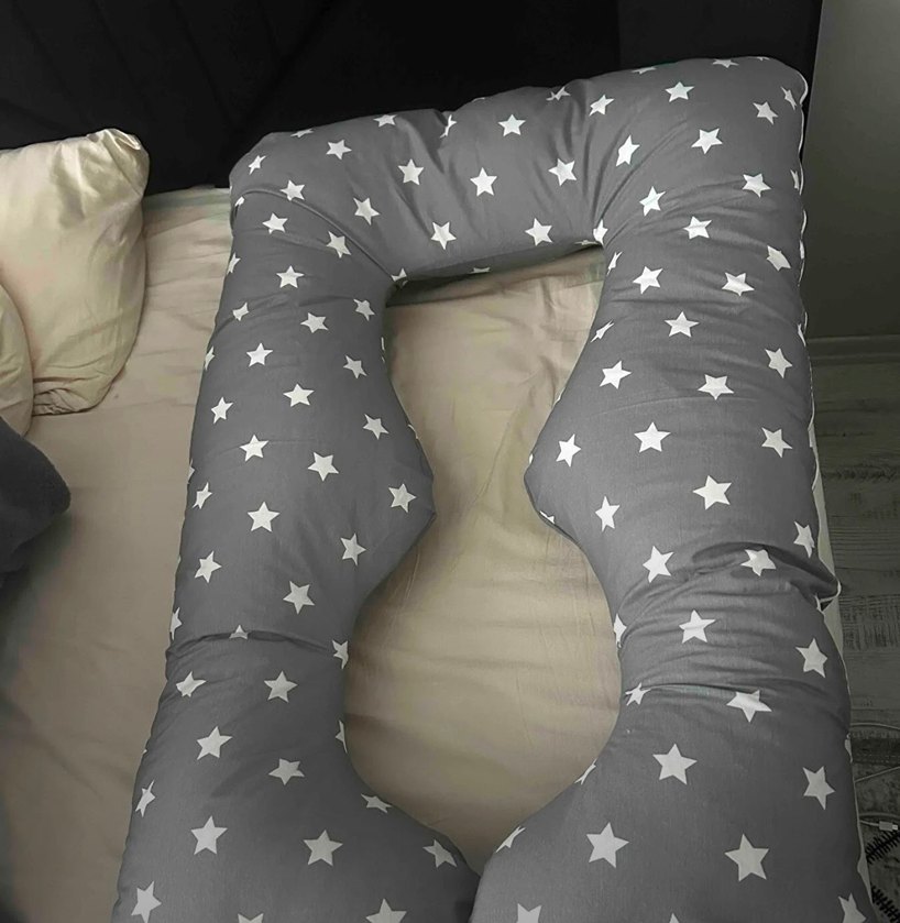 Son 2 ayımda kullandım çok rahatlattı sıfırdan farksız. Gri zemin üzerine beyaz yıldız desenli hamile ve emzirme yastığı, konforlu destek sağlar.