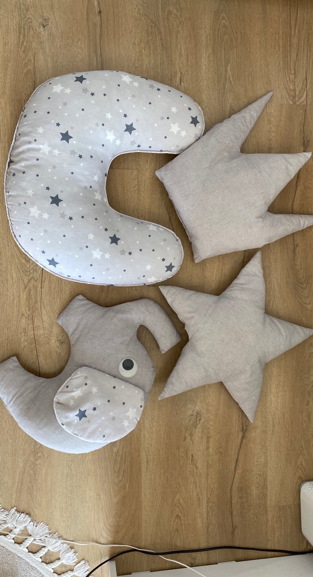 Gri renkli, yıldız nakışlı hamile ve emzirme yastığı ile taç, yıldız ve fil şeklinde üç yumuşak dekoratif yastık içerir. ️