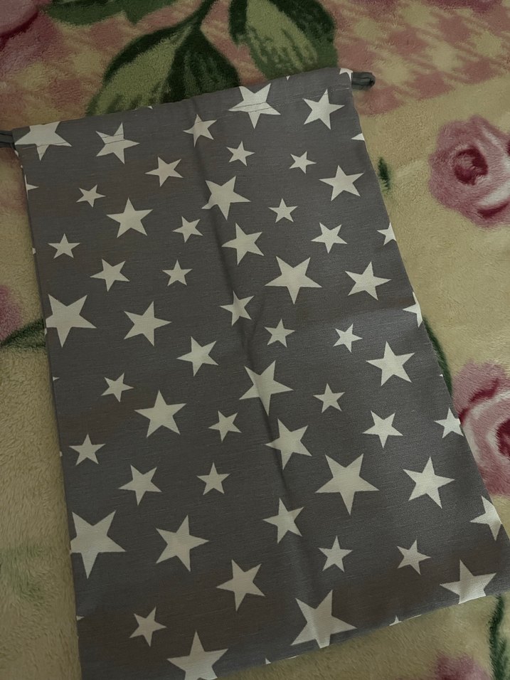 Gri zemin üzerine beyaz yıldız desenli, yumuşak sentetik kumaştan kese. ⭐