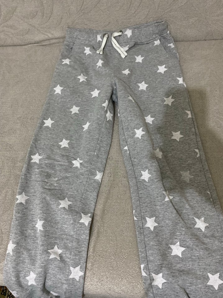 Pamuklu örgü kumaştan, beyaz yıldız desenli, bol kesim gri kız eşofman altı. Günlük rahat sokak stili için uygundur.
